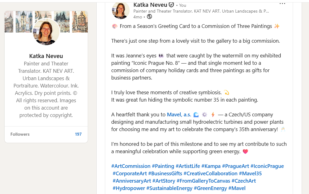 Art has the power to communicate what words cannot. A personalized artwork reflects your company's spirit, strengthens relationships, and creates a lasting impression. Whether it's a painting of Prague's iconic landmarks, a symbolic motif connected to your story, or a bespoke piece for your office interior, each artwork is crafted to resonate with your values and message.