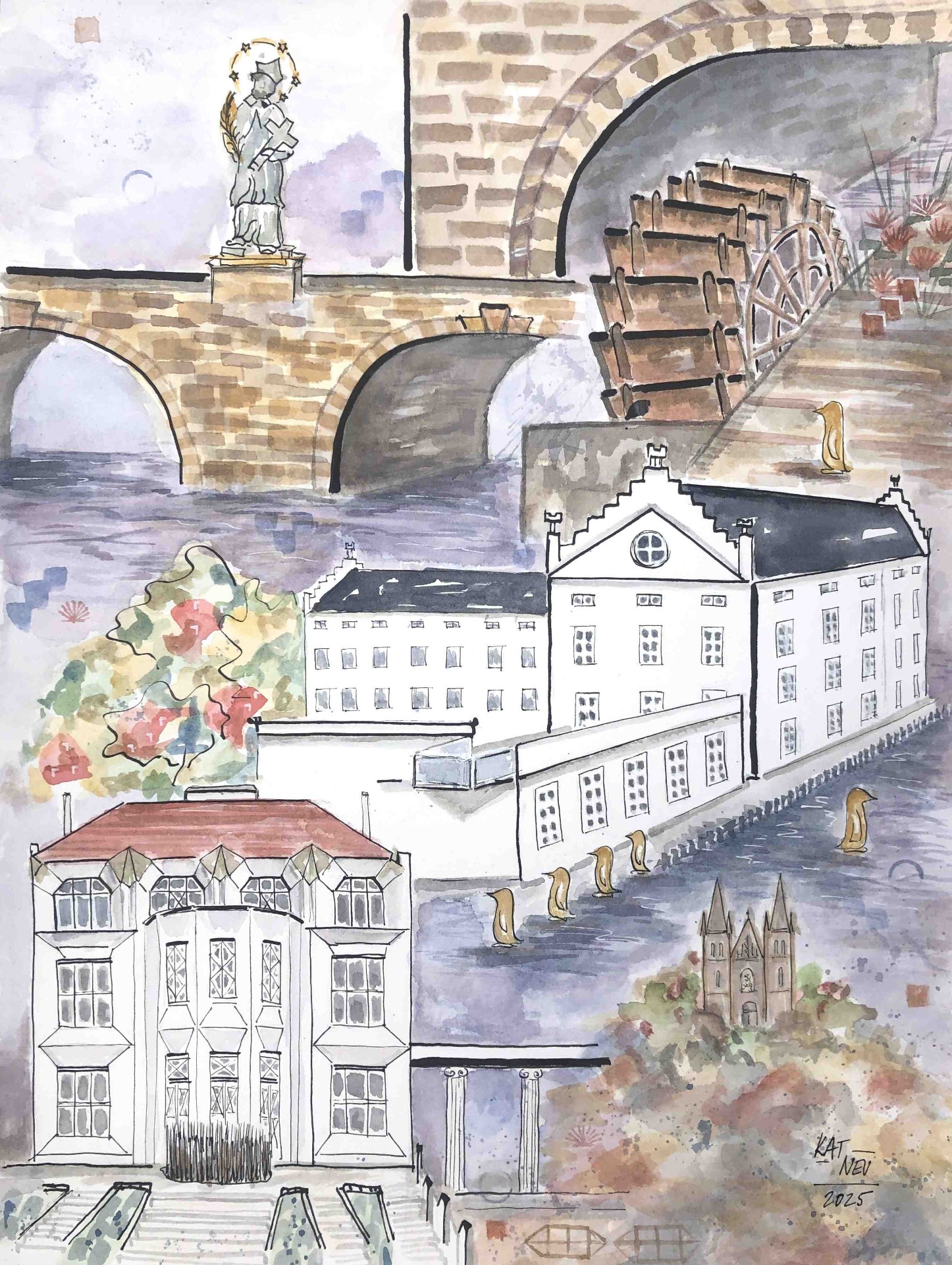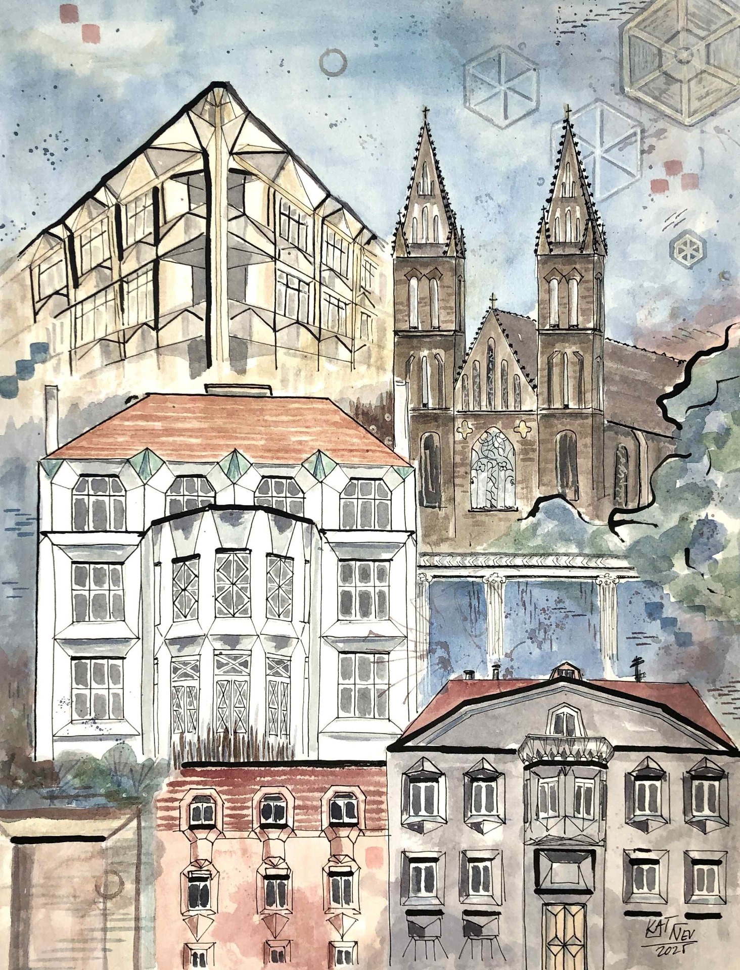 Long-term project Iconic Prague started in 2024 as poetic exploration of Prague's identity. Inspired by Italo Calvino's novel Invisible Cities, Katka blends iconic monuments with intimate, personally significant places—creating dreamlike urban landscapes. Her technique combines collage with ink and watercolour, evoking a sense of memory, fragmentation, and emotional resonance.